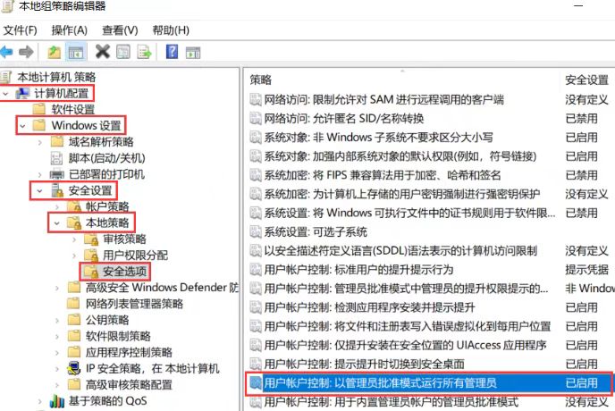 12、软件无法安装或打开时,提升管理员权限。打开组策略gpedit.msc 依次点击-计算机配置-Windows设置-安全设置-本地策略-安全选项-(右侧找到并双击)用户账户控制:以管理员批准模式运行所有管理员(设置为禁用,然后重启电脑)
