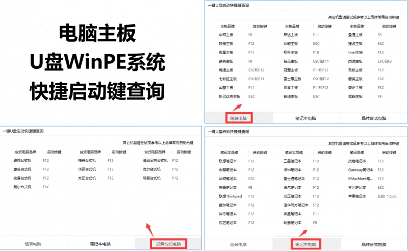 一、根据下图查询电脑主板U盘启动快捷键,然后重启电脑,重启后不断的按键盘 对应主板的 U盘快捷启动键