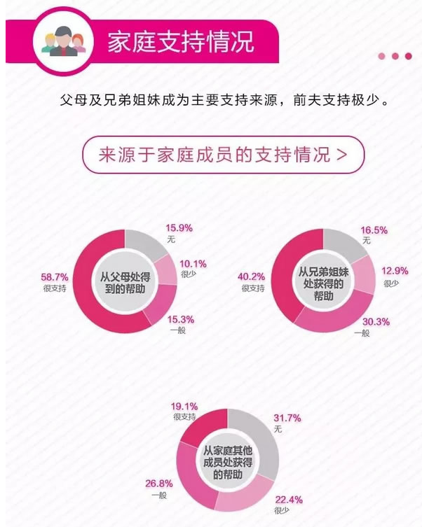 2018年1月,唯品会曾经做过一次单亲妈妈数据调研,面向全国四大城市600名单亲妈妈,虽然超过60%的单亲妈妈有工作,但收入500元以下的占8%,30%左右的单亲妈妈收入在3000元左右,6000元已经算是高工资。事实上,给单亲妈妈最大支持的有且只有父母,而前夫是支持最少的。