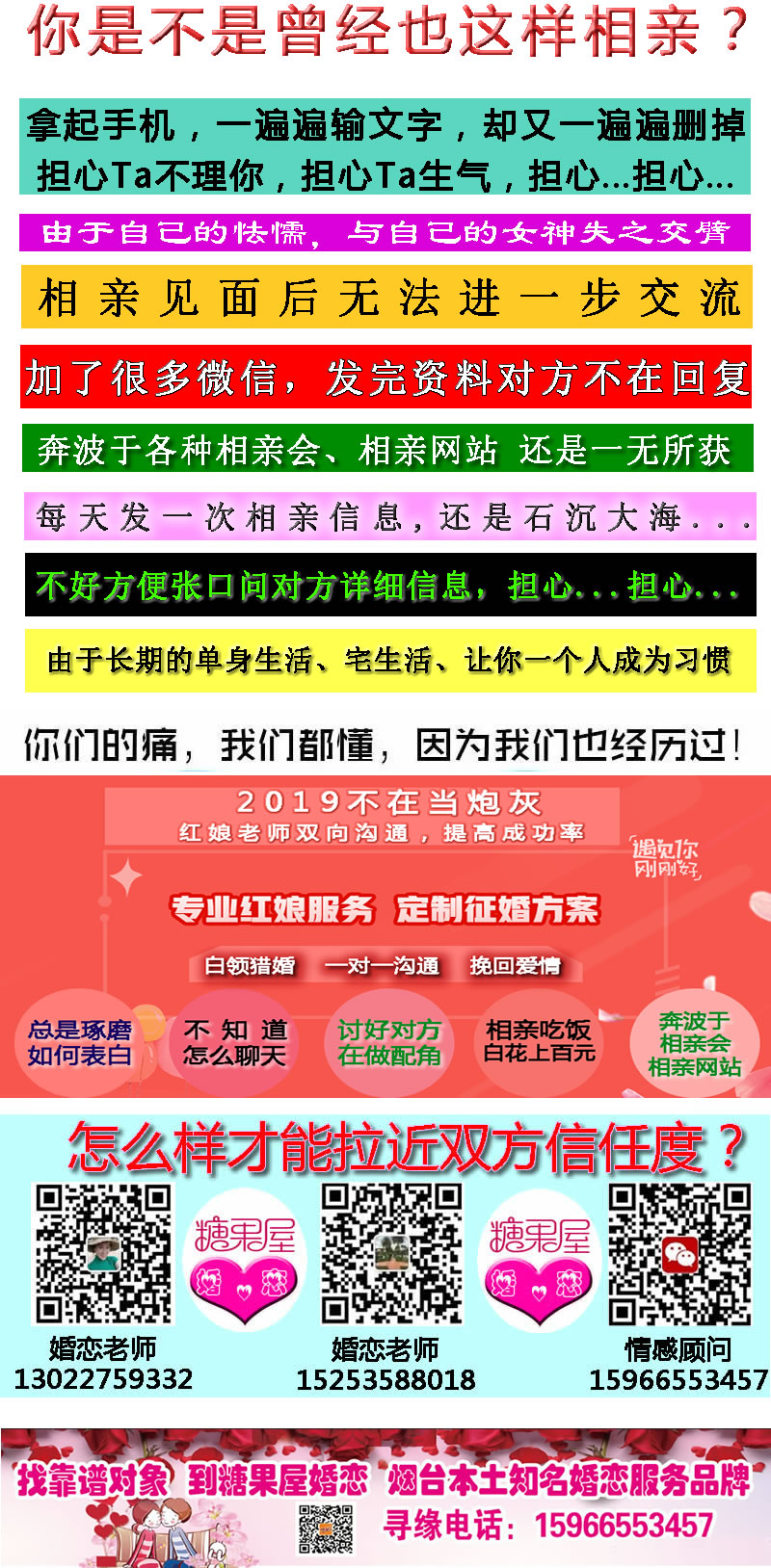 相亲信息多不代表成功率高,与其毫无头绪地四处寻觅,不如求助专业又负责的婚介机构。烟台糖果屋婚姻服务中心专业的婚恋师会做一系列的指导:做情感梳理---给出建议---制定相亲方案---在恋爱相亲过程给予指导。