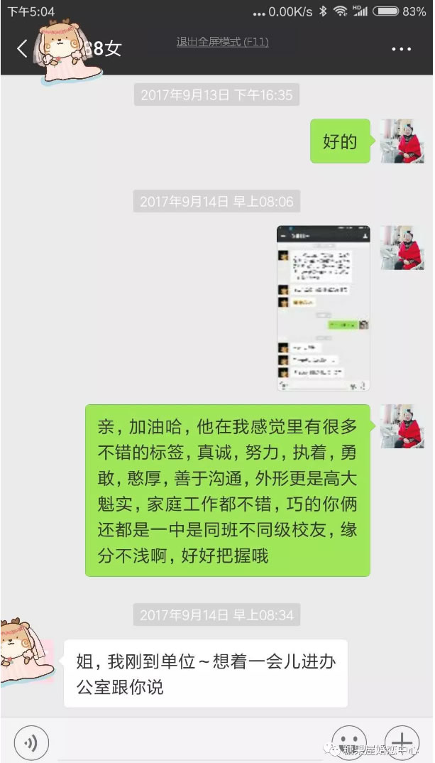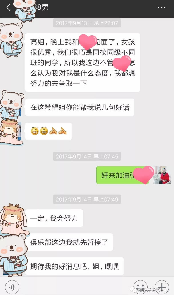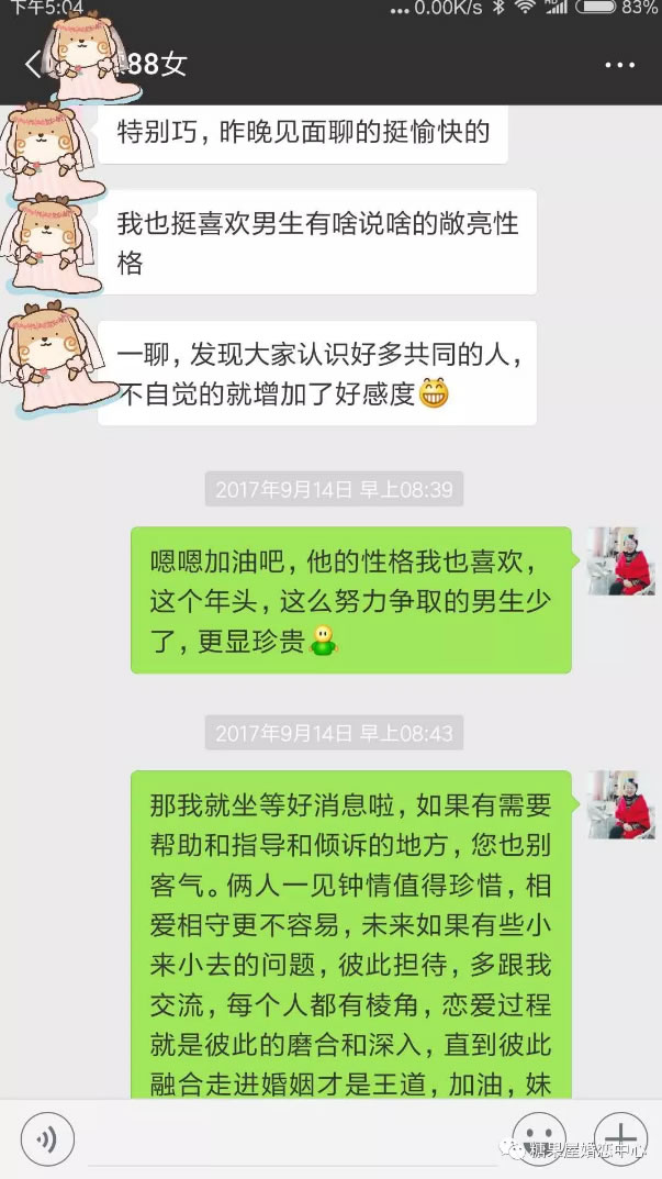 缘分就那么不期而遇,白马王子真的遇到了白雪公主,她是糖果屋给张先生筛选安排约见的第一位女会员, 2017年9月13的晚上,他们相约而见,也许真的是前世的缘未了,他们相聊甚欢,彼此都满意度较高。男生在约会结束后晚上10点多主动分享约会状态,并表达了自己认可喜欢的心情,甚至请糖果屋高老师帮忙从中多说好话,不过更重要的一句话在哪里,你们谁发现了??正是大部分女生都想要的那句话,对了, 很多人发现了, 就是:不管**怎么认为我对我什么态度,我都想努力的去争取一下。